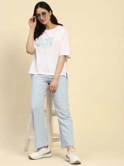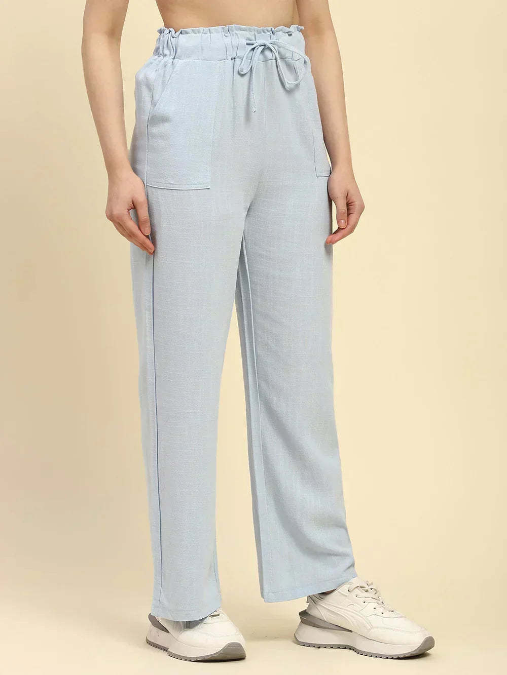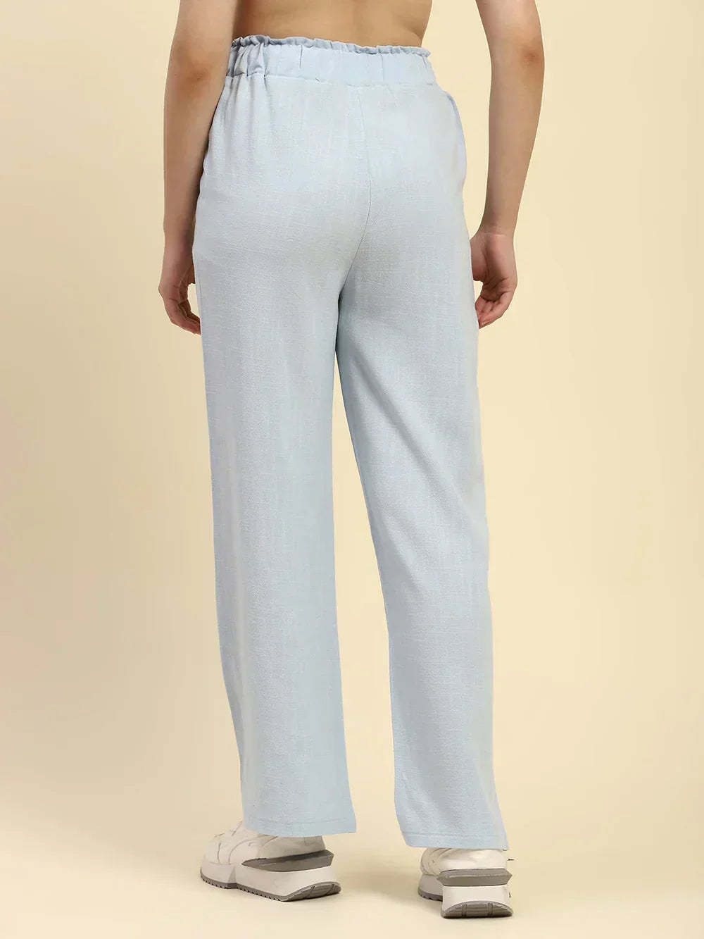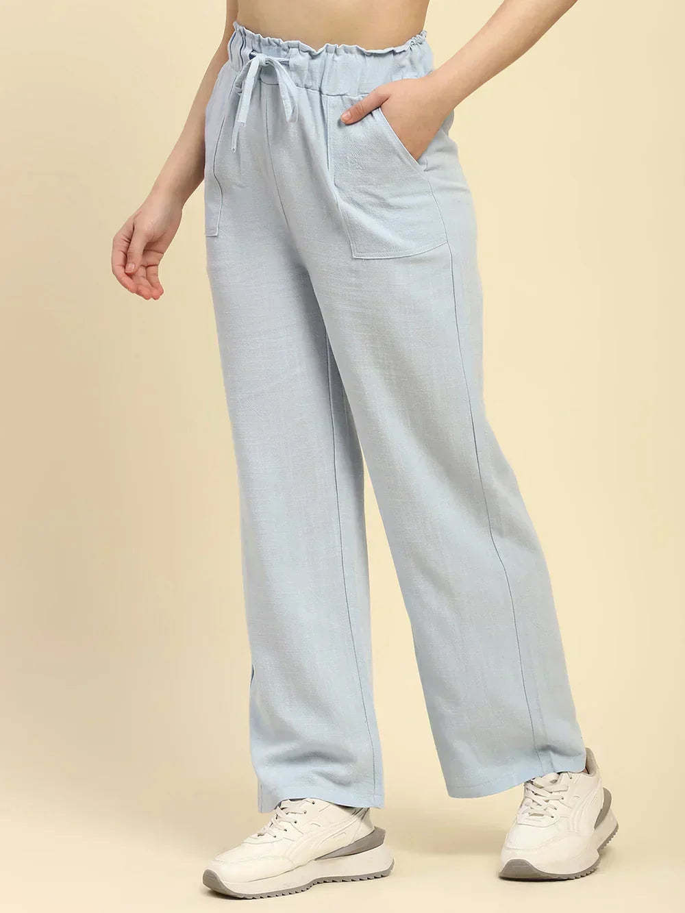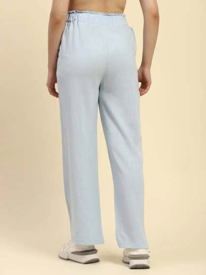Blue Solid Cotton Linen Relaxed Fit Trouser